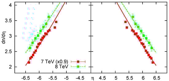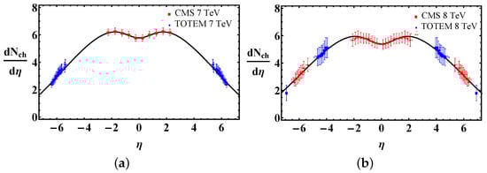 (a) Charged particle distributions from CMS [51] and TOTEM [66] at 7 TeV fitted with the result of our relativistic hydrodynamical solution described in this paper, with ; (b) Charged particle distributions from CMS and TOTEM 8 TeV data of Reference [62,67] fitted with our results, with .