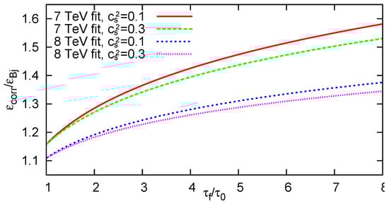 Assuming (this is a quite realistic value, at least no harder EoS is expected at LHC, as similar EoS was found at the RHIC as well [14,59,60]), one only needs a value. As shown in Equation (3), temperature is proportional to . >From this, . Thus, if the freeze-out temperature is MeV, then an initial temperature of MeV (needed in order to form a strongly interacting quark gluon plasma) corresponds to being 5–6 times , for and . Even if and λ are higher, seems to be a rather conservative value. With this, one gets a correction factor of 1.262, thus the corrected initial energy density estimate is