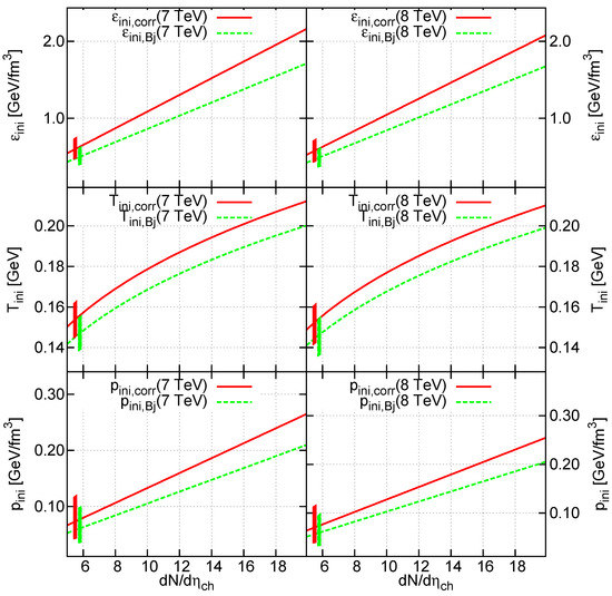 Now let us estimate what happens at TeV. As for the Bjorken-estimate, we need the change in charged particle multiplicity, average transverse energy and transverse size. CMS indicates for a non-single diffractive enhanced data sample in Reference [62], while is given in Reference [63]. The average of the two values is in good agreement with the approximate s dependence of of as estimated in Reference [62]. Average transverse momentum s dependence is estimated as in Reference [51], which means a 1.53% increase in . Transverse size can be estimated based on the measurement of References [64], mb, which means a 3.8% increase in area compared to 7 TeV, and fm Based on Equation (10); this altogether means a 2.4% increase in , i.e.,