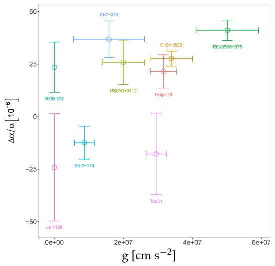 Preliminary results. Variation in the fine structure constant vs estimated surface gravity, . For each object in the sample we fitted Voigt profiles simultaneously to the relevant quadruply ionized iron (FeV) and quadruply ionized nickel (NiV) absorption lines of each object and estimated using VPFIT. Here we show an example of our preliminary results, using the Ward and Nave (2015) [] laboratory wavelengths. We see a similar trend using the Kramida and Tchang-Brillet wavelength lists. Error bars are 1 . The error bars on surface gravity for ROB 162 and vZ 1128 (both sub-dwarf objects) are too small to be seen in this plot.