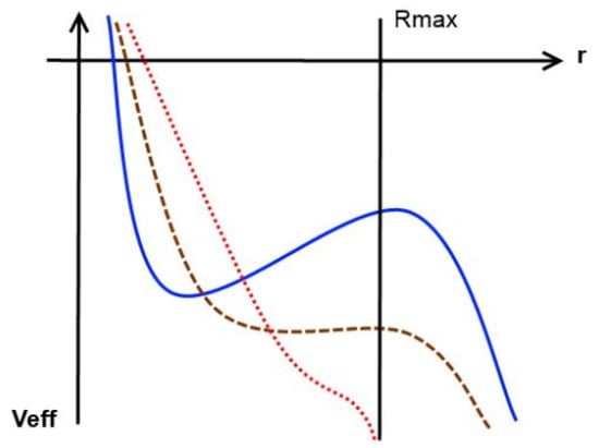 - If diverges slower than (i.e., ), the second term in the bracket in (15) is negligible compared with the first term. However, whether the first term dominates over the third term depends on the exact form of and . In either case, the potential reaches positive infinite values when both a and x go to infinity.