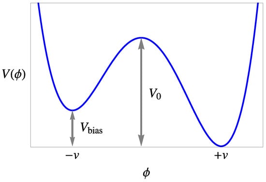One possible solution to the domain wall problem is to introduce an energy bias in the potential, which lifts the degenerate minima [,,].3 Let us consider the model for the real scalar field discussed in Section 2.1. Here, we artificially introduce the following term