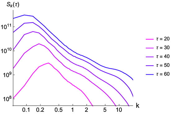 with V being the volume of the comoving simulation box. The spectrum has a peak at the scale corresponding to the Hubble radius. We note that the horizontal axes in Figure 2 represents the comoving wavenumber, and hence the location of the peak shifts according to . Since the smallest scale of the structure of domain walls is given by their core width [see Equation (4)], the spectrum falls off at a large wavenumber corresponding to that scale, . Furthermore, increases as for , and decreases as for . The behavior at small k can be deduced from causality [,].