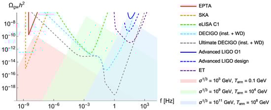 From the configuration of the scalar field in the numerical simulations, one can estimate the spectrum of GWs produced by them. The results obtained in Ref. [] are shown in Figure 2, where represents the spectrum of GWs per unit logarithmic frequency interval,