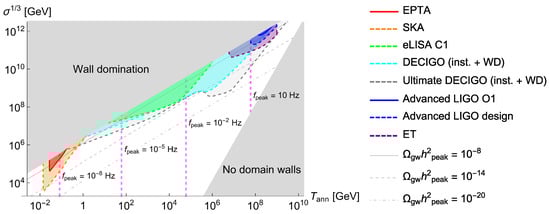 - Hiramatsu, T.; Kawasaki, M.; Saikawa, K.I. Gravitational Waves from Collapsing Domain Walls. J. Cosmol. Astropart. Phys. 2010, 2010, 32. [Google Scholar] [CrossRef]