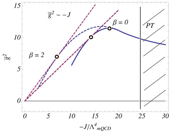 where . The coupling touches the linear function at the point (indeed, it has the same value and derivative). And vice versa, if touches at some point , then , which means that Equation (15) is satisfied at . Indeed, the existence of such a contact point is a necessary and sufficient condition for the solution (15) with fixed . This allows us to constrain generic non-perturbative behavior of the corresponding . An illustration of the corresponding infrared behavior of the mQCD coupling in consistency with both the non-perturbative asymptotics for the -function (15) and the conventional perturbative regime of asymptotic freedom (5) is shown in Figure 1. A desirable non-monotonic shape of the coupling was earlier discussed in the case of usual QCD [53,54].