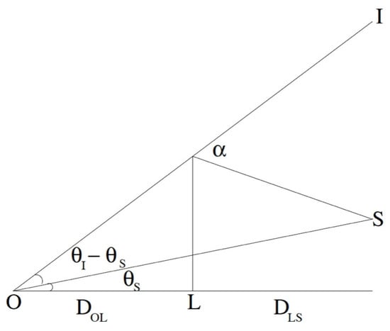 In the triangle OIS, IS = , where is the distance between the observer and the background source. The light bending angle