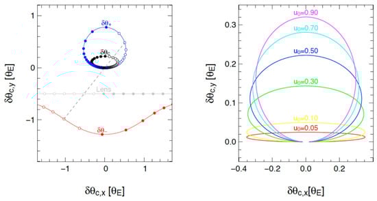 Centroid shifts of a single lens microlensing event. (left) trajectories of the plus-image (blue), minus-image (red), and the centroid (black). The lens trajectory is shown in grey. We assume , days and ; (right) centroid shifts for different values of . This figure is adopted from “Lee et al., Mon. Not. R. Astron. Soc. 2010, 407, 1597–1608” [85].
