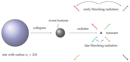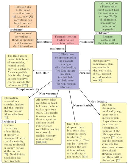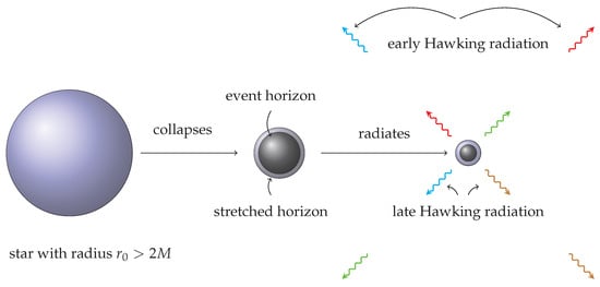 - It is also about geometry non-trivia:The main difference a black hole has from the other horizon settings we commented above is that the black hole not only breaks the homogeneity due to curvature, it also breaks time reversal invariance in order to give rise to time irreversible phenomenon like radiation. In fact the sitting in Equation (4) is understood to be total time, such that particle creation rate per unit time becomes exactly that of a radiating body. Thus, it is the breaking of these symmetries which allow the flux of energy radiated away to be non zero [59,60] when calculated from . Thus, non trivial geometry of the spacetime added with the presence of horizon makes the black hole radiate thermally (predominantly). This is the point exactly where we make true contact with the thermodynamics of the black hole we kept believing in (even when a concrete proof was not available), and this, unfortunately, is also exactly where the problem at hand starts unfolding.
