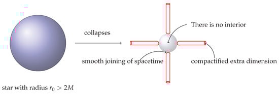 - In canonical splitting of gravity, we end up with various constraints on the variables of the theory, we use to describe the same. These constraints appear as operator equations at the quantum level, if we keep using these variables in quantum gravity. Using the method of discretization of spacetime lattice [116], one can argue that the solution space, consistent with diffeomorphism constraints, with positive frequency, is obtained through states of the kindrepresenting a collapsing shell marked as i, with giving its proper time, being its area radius (in the case of spherically symmetric collapse) at proper time and is related to the mass function of the shell. a and b are functions of . Now, vanishing of determines the location of the apparent horizon, classically. So the classical location of the apparent horizon () serves as a point where the wave functional in Equation (38) develops a discontinuous behavior15. The argument of the exponential has a discontinuous (by an amount of residue at the pole) across the “apparent horizon”. Moreover for a particular branch (i.e., with choosing one sign of the ± in the exponent), we see that the directions of the shells across the horizons are opposite.Using this approach of canonical quantization, it can be argued [116] that any collapse of matter in the exterior of the apparent horizon of the collapsing data is accompanied by an out going radiation in the interior of the apparent horizon (and vice versa)16[116]. It is further argued [117,118] that, the absence of firewall must require that only one branch of solutions exists, i.e., a collapsing shell in the exterior accompanied by a thermal radiation in the interior. There should not be any branch that has a collapsing shell in the interior accompanied by a Hawking radiation in the exterior. Therefore, the profile of mass distribution of the shell should be such that its collapse is effectively counterbalanced and gets supported by the interior thermal radiation. Such a mass profile, the size of a resulting “stable structure” and its relation to gravitational mass of the cloud is estimated for different cases [118,119]. Therefore, in this scenario, the collapse halts at the apparent horizon and the black hole never forms in the first place. All what is left is a dust cloud-ball hinging at the apparent horizon, as a stable remnant, being supported by a radiation pressure from the inside necessitated by quantum gravity. This cloud-ball also hides in its inside, a negative mass singularity which gives rise to the radiation flux in the interior.
