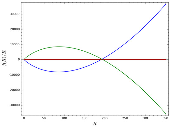 Plot of versus R from Equation (28) for , , and for the exponential expansion, where the green and blue lines refer to the positive and negative Lagrangian for , while the red line refers to the Lagrangian for general relativity (GR). One can see that the deviations from GR occur at higher-curvature regimes.