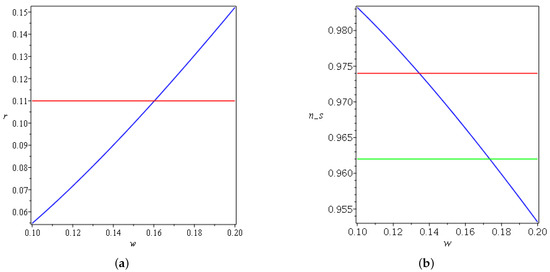 The following Figure 4, Figure 5, Figure 6, Figure 7 and Figure 8 summarize the change of the parameters and to obtain both a spectral index and tensor-to-scalar ratio r close to the observational values for the linear law of expansion for the case in which . Where and , one has negative and complex values for the spectral index and the tensor-to-scalar ratio r; this evidently rules out the corresponding Lagrangian from the viable values. It is clear from the Figure 4, Figure 5, Figure 6, Figure 7 and Figure 8 presented in this work that the observational results of and r constrain the ranges of the parameters under variation. In Figure 4a, one can notice that r increases monotonically as a function of w until it surpasses the upper limit of the Planck data, which constrain that . On the other side in Figure 4b, the spectral index decreases as w changes, and the only acceptable values can be obtained between and . In Figure 5a, after crosses the observational value, it asymptotically varies with the increasing of A. On the other side, in Figure 5b, increases and saturates to a finite amplitude after it crosses the lower bound of the Planck data. In Figure 6a, the tensor-to-scalar ratio r decreases with the increasing of , and the values that are compatible with observation are achieved after passing . In Figure 6b, the spectral index increases with the increasing of until it crosses the lower and the upper boundaries of the observational data. The same behavior is manifested in Figure 7a,b for r and with changing .