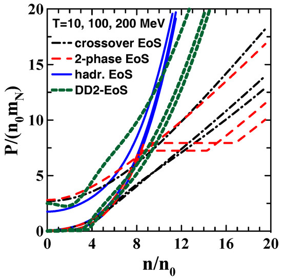 Pressure scaled by the product of normal nuclear density ( = 0.15 fm−3) and nucleon mass () versus baryon density (scaled by ) for three EoSs used in the simulations and also for the DD2 EoS [34] that is compatible with astrophysical constraints. Results are presented for three different temperatures = 10, 100 and 200 MeV (bottom-up for corresponding curves).