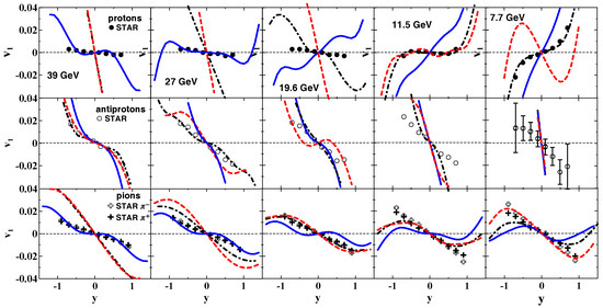 The 3FD simulations were performed for mid-central Au+Au collisions, i.e., at impact parameter = 6 fm. Following the experimental conditions, the acceptance 2 GeV/c for transverse momentum () of the produced particles is applied to all considered hadrons. This choice is commented in Ref. [18]. In the 3FD model, particles are not isotopically distinguished; i.e., the model deals with nucleons, pions, etc. rather than with protons, neutrons, , and . Therefore, the values of protons, antiprotons and pions presented below, in fact, are of nucleons, antinucleons and all (i.e., , and ) pions. The directed flow as a function of rapidity y at BES-RHIC bombarding energies is presented in Figure 2 for pions, protons and antiprotons.