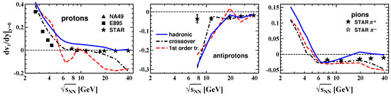 The directed flow of identified hadrons—protons, antiprotons, positive and negative pions—in Au+Au collisions was recently measured in the energy range = (7.7–39) GeV by the STAR collaboration within the framework of the beam energy scan (BES) program at the BNL Relativistic Heavy Ion Collider (RHIC) [14]. These data have been already discussed in Refs. [15,16,17,18,19,20,21,22]. The Frankfurt group [15] did not succeed to describe the data and to obtain conclusive results. Within a hybrid approach [23], the authors found that there is no sensitivity of the directed flow on the EoS and, in particular, on the occurrence of a first-order phase transition. One of the possible reasons of this result can be that the initial stage of the collision in all scenarios is described within the Ultrarelativistic Quantum Molecular Dynamics (UrQMD) [24] in the hybrid approach. However, this initial stage does not solely determine the final directed flow because the UrQMD results still differ from those obtained within the hybrid approach [23].