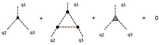 Diagram representation of the compensation equation in the first approximation. Dotted lines correspond to gravitons, a black spot represents the interaction by Equation (2), and the striped triangle represents the contribution of the Standard Model diagrams.