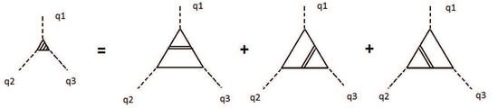 Diagrams describing the first approximation for the Standard Model contribution to three-graviton vertex (Equation (2)). Simple lines correspond to matter fermions (quarks, etc.) and double lines correspond to weak bosons W.