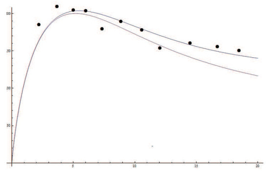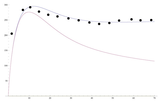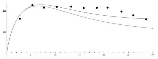 where is a galaxy mass in , is its radius in kpc, and r is a distance in a rotation curve, also in kpc. Then we adjust the galaxy mass and radius to obtain a corresponding rotation curve. We have taken three galaxies as examples. The black spots in the figures denote observational data, taken from [22]. The upper curves in the figures correspond to Equation (25). The lower curves in the figures correspond to (i.e., without our effect).