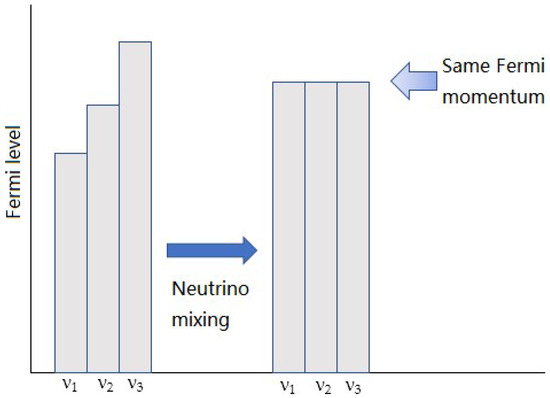 Another critical constraint for Equation (1) is that neutrinos must have mass. The existence of neutrino flavor mixing means that neutrinos have mass, and this experimental discovery was rewarded with the 2015 Nobel Prize in Physics [19]. The Particle Data Handbook gives an upper bound to the electron anti-neutrino of <2 eV/c2 [11].5 Mass mixing is only possible if the neutrinos have very close spacing of their masses: