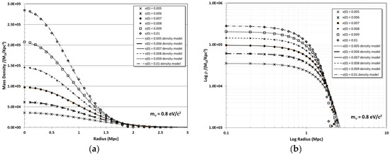 The figure shows the mass density (ρ) per solar mass per Kilo-parsec (kpc) cubed against the CNO radius in Mega-parsecs (Mpc) for a degenerate neutrino mass of 0.8 eV/c2 for central x(0) boundary conditions ranging from 0.005 to 0.01 with overlaid Einasto density model fits as: (a) linear-linear plot; (b) log-log plot.