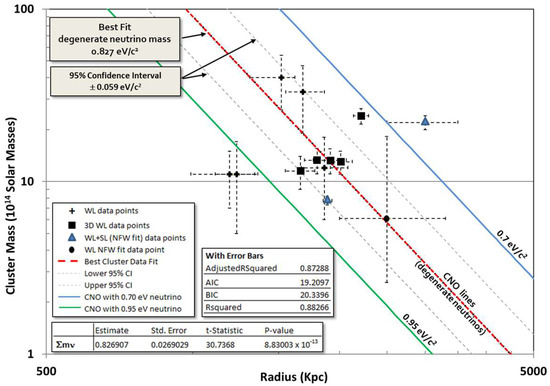 Table 1 shows that CNO are the largest and most massive objects in the universe. It also discloses the key signature: degenerate Fermi matter EOS, whether neutron stars (nucleons) or white dwarfs (electrons), have the distinctive property that the more massive the object is, the smaller the radius it has. This is in counter-distinction to iron–silicate EOS such as earth’s. We used gravitational lensing (gravitational bending of light) and flat space–time to measure the mass and radii of Dark Matter objects embedding galaxy clusters and showed that the curve had a negative slope, as predicted by Table 1 [20]. The negative slope, of course, depends on the value of the degenerate neutrino mass mν. By fitting the Dark Matter observational data, an approximate value of mν can be predicted. It is this predicted value that the KATRIN experiment [17] should use, since its team is directly measuring the mass of the electron anti-neutrino, which should be nearly the value of the common degenerate neutrino mass.