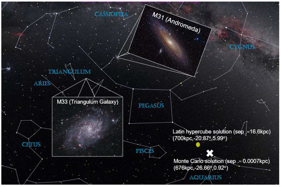 Recently, we checked our Monte Carlo FORTRAN results (reference [21]) using an independent implementation in C++ with a Latin Hypercube9 (LHC) algorithm [33] in order to speed up the time it takes to achieve convergence. The C++ implementation was executed in such a manner as to iteratively improve the LHC lattice spacing until a solution appeared to be converging on the same convergence identified using the FORTRAN code. Figure 7 uses the Satellite Orbital Analysis Program (SOAP) version 14.0.7, from The Aerospace Corporation [34], to plot the location of the CNO center from the LHC and Monte Carlo FORTRAN implementations, showing that it is in the constellation Aquarius.