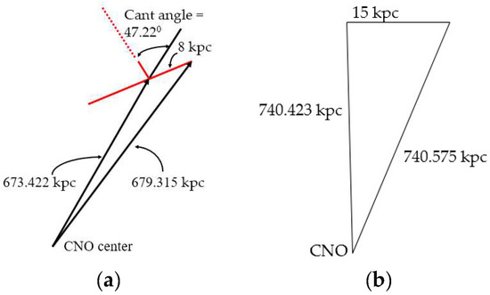 The geometry for the CNO’s center to distances from the center of the galaxies was used for computing the density differences for: (a) the canted Milky Way’s center to 8 kilo parsecs out from the center using the law of cosines; (b) the simpler geometry for M31 from the center to 15 kilo parsecs out with no cant angle.