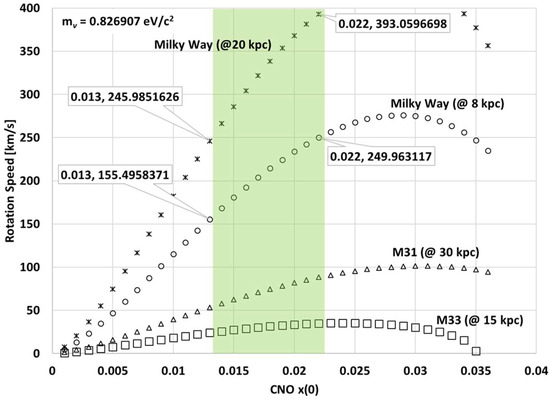 Figure 9 provides an example of plots used to identify acceptable local group galactic speed solutions (y-axis) for a CNO (in this case with a degenerate neutrino mass of 0.826907 eV/c2) for various central boundary condition values for the Fermi momentum ratio x(0) = (x-axis). Galactic speed constraints from the scientific literature for the Milky Way at 8 and 20 Kilo-parsec (kpc) were used to define the greyed-out area of acceptable Fermi momentum ratio solutions.