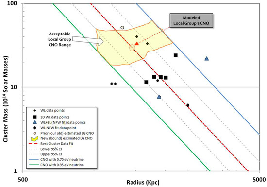 The plotted virial mass and radii from identified weak lensing data now also displaying acceptable Local Group CNO solutions, including the CNO mass and radii values used in Figure 11.