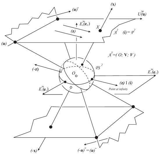 Our projective spherical model, initiated in [1], is based on linear algebra over the real vector space (for points) and its dual (for planes) (see Figure 1), up to a positive real factor, so that the proper dimension is 3. We can illustrate and visualize the topic in the Euclidean screen of a computer.