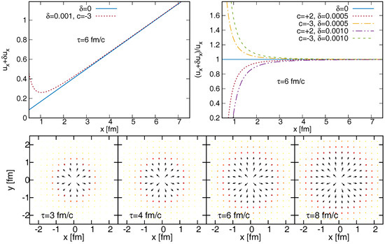The perturbed flow field component () is shown in the left plot as a function of x, for fm/c (the other parameters are given in the text). The right plot indicates the relative change for various and c values. The bottom plot shows the flow perturbation field in the transverse plane, for various proper-time values.