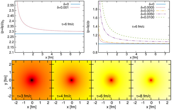 The perturbed pressure is shown in the left plot as a function of x, for fm/c (the other parameters are given in the text). The right plot indicates the relative change for various and c values. The bottom plot shows the pressure perturbation in the transverse plane, for various proper-time values.