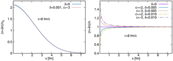 The perturbed density is shown in the left plot as a function of x, for fm/c (the other parameters are given in the text). The right plot indicates the relative change for various and c values.