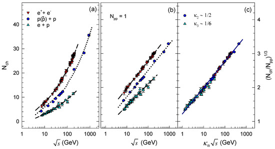 (a) vs. collision energy for e+e [37], p()+p [38,39,40,41,42] and [43,44,45] collisions; (b) vs. collision energy; (c) vs. for the values indicated. The curves are drawn to guide the eye.