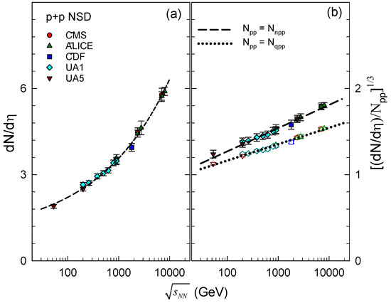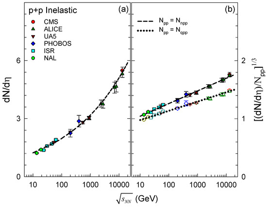 for the mid-pseudorapidity density for INEL and NSD collisions. Here, it is noteworthy that the recent INEL measurements at TeV by the CMS [46] and ALICE [47] collaborations are in very good agreement with the scaling prediction shown in Figure 2b.