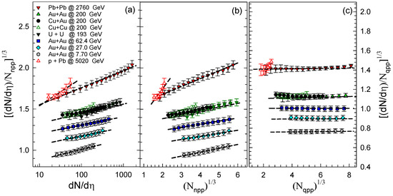 Figure 4c contrasts with Figure 4a,b. It shows that, when is used instead of , the size dependence of (but not its dependence), apparent in Figure 4b, is suppressed. We attribute the flat dependence of on the size ( or ) to the linear dependence of on (related to the initial size), as illustrated in Figure 5a for Pb+Pb and Au+Au collisions. We note that for central and mid-central p+Pb collisions, decreases with ; this results in a reduction of the energy released in these collisions, as well as large multiplicity fluctuations.