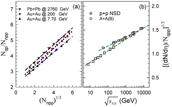 Figure 2a and Figure 3a show measurements for INEL and non-single-diffractive (NSD) collisions, respectively, for beam energies spanning the range GeV − TeV (we note that for collisions, , we however use the latter term to be comparable to p+A and A+A(B) collisions; we note furthermore that for some of the cases, ; hence here we use the more general term). These plots indicate a monotonic increase of with , similar to that observed for in Figure 1a. Figure 2b and Figure 3b, by contrast, confirm the expected linear growth of with (where again we make use of the relation for collisions). Here the expectation for the linear trend is based on the mean transverse momentum () for the particles emitted in these collisions, increasing as . The open points and dotted curves in these figures affirm the expected trend for the dependence of . Here, the change in magnitude largely reflects the difference in the proportionality constants for and (as in and ). The fits, indicated by the dashed curves in Figure 2b and Figure 3b, give the expressions