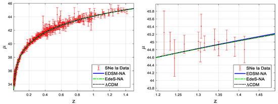 15]. Their approach has been to modify the Friedmann and acceleration equations by adding extra terms and derive the continuity (fluid) equation from the first law of thermodynamics, assuming nonadiabatic expansion caused by the entropy and temperature on the horizon. The solution of the equations is thus based on multiple unknown parameters that need to be determined by fitting the SNe Ia data. Our approach here modifies only the fluid equation from the first law of thermodynamics on the assumption that the system energy gain or loss is proportional to the energy of the system—Equation (5). No adjustable parameters, other than the universal Hubble constant, are required to fit the data. The deceleration parameter that is needed in our nonadiabatic formulation is analytically obtained from the EDSM model [