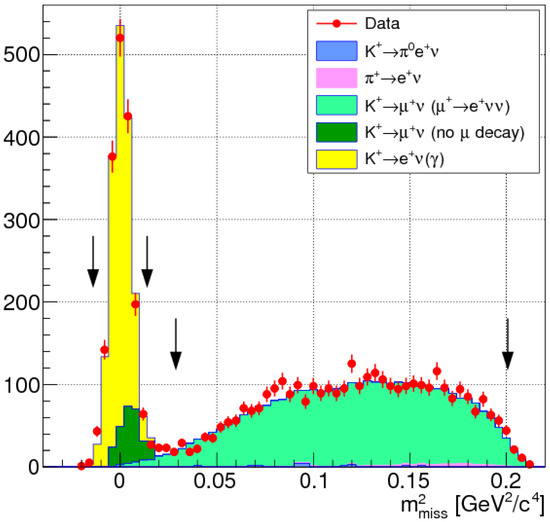 where , and are, respectively, the four-momenta of the kaon, the charged pion and the photon. In the squared missing mass distribution, a peak is expected around . The main background comes from the SM decay , when one photon is lost; however, in that case, the squared missing mass distribution would peak around zero [14].