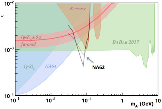 In several hidden-sector models, an extra U(1) gauge symmetry leads to the presence of an invisible vector boson, , also known as a Dark Photon (DP), which acts as a portal between the SM and the dark sector [12]. The DPs would also provide a possible explanation for the positron excess in cosmic rays and the muon measurement [13]. NA62 can search both for visible and invisible DP decays.
