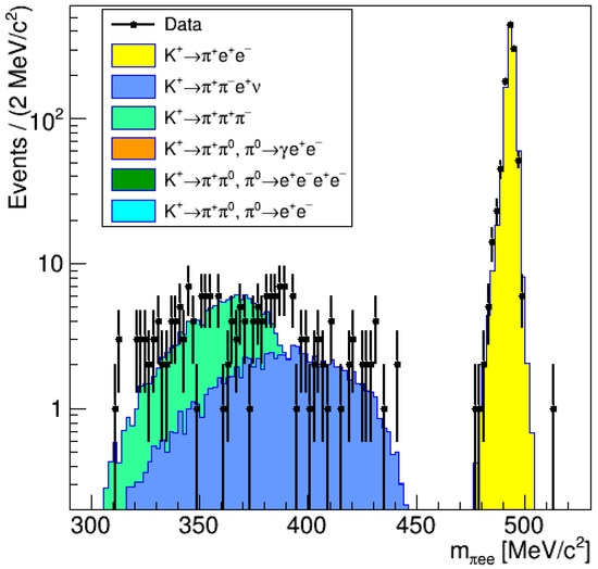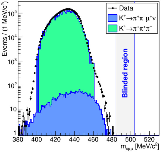 Reconstructed mass distribution of candidates with 488 MeV/c2 MeV/c2; data and MC estimates of various processes are visible, together with the NA62 first observation of the rare decay [15].