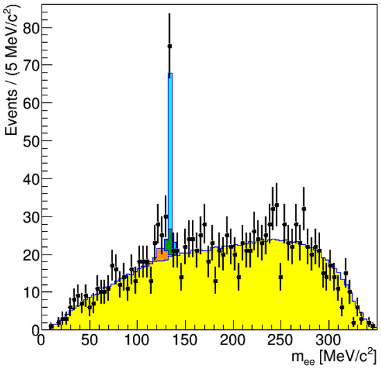 Reconstructed mass distribution of candidates in the background-free region MeV/c2; data and MCestimates of various processes are visible [15].
