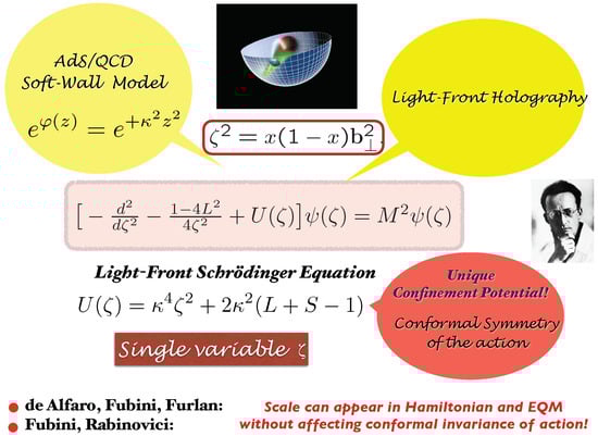 - De Téramond, G.F.; Brodsky, S.J.; Dosch, H.G. Hadron Spectroscopy and Dynamics from Light-Front Holography and Conformal Symmetry. In Proceedings of the EPJ Web Conference, Rome, Italy, 30 September–4 October 2013; Volume 73, p. 01014. [Google Scholar]