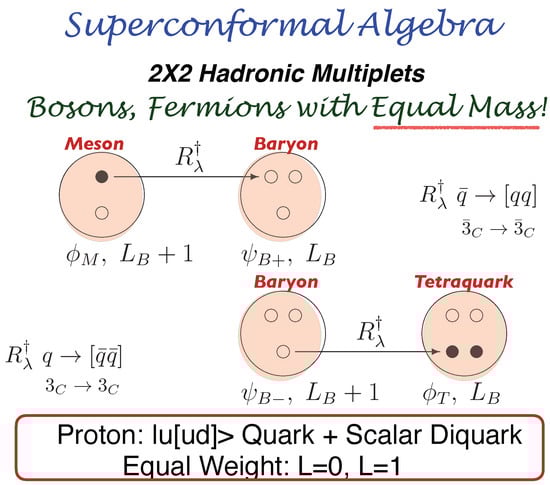 Another advance in LF holography is the application of superconformal algebra, a feature of the underlying conformal symmetry of chiral QCD. The conformal group has an elegant Pauli matrix representation called superconformal algebra, originally discovered by Haag, Lopuszanski, and Sohnius [31] (1974) The conformal Hamiltonian operator and the special conformal operators can be represented as anticommutators of Pauli matrices and . As shown by Fubini and Rabinovici, [32], a nonconformal Hamiltonian with a mass scale and universal confinement can then be obtained by shifting , the analog of the dAFF procedure. In effect, one has obtained generalized supercharges of the superconformal algebra [32]. This ansatz extends the predictions for the hadron spectrum to a “4-plet” —consisting of mass-degenerate quark-antiquark mesons, quark-diquark baryons, and diquark-antidiquark tetraquarks, as shown in Figure 2. The 4-plet contains two entries for each baryon, corresponding to internal orbital angular momentum L and . This property of the baryon LFWFs is the analog of the eigensolution of the Dirac-Coulomb equation which has both an upper component and a lower component .