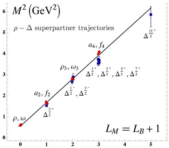 Comparison of the meson Regge trajectory with the baryon trajectory. Superconformal algebra predicts the degeneracy of the meson and baryon trajectories if one identifies a meson with internal orbital angular momentum with its superpartner baryon with See Refs. [38,39].