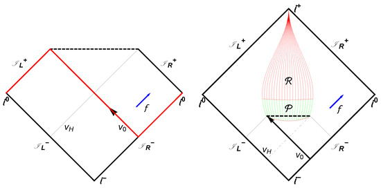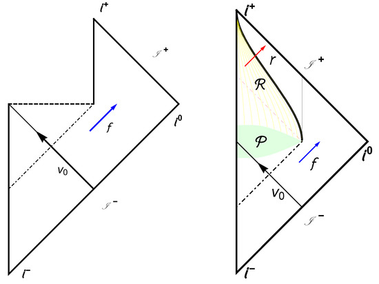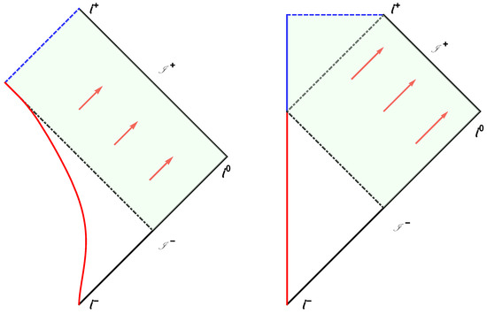 In the first case, Equation (13), some left-mover field modes never hit the origin and consequently never become right-movers. These modes are lost forever in the black hole. However, in the second case, Equation (14), an asymptotic approach to time-like future infinity, , means that all the left-movers hit the origin and they all become right-movers, preserving information measured by an observer at .