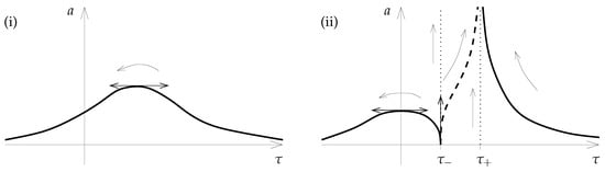 For completeness, we signal that the case is somehow “infinitely supercritical” when . It requires and yields an evolution qualitatively similar to the above one. When , the maximum of the scale factor is formally sent to infinity, and the trajectories become monotonic.