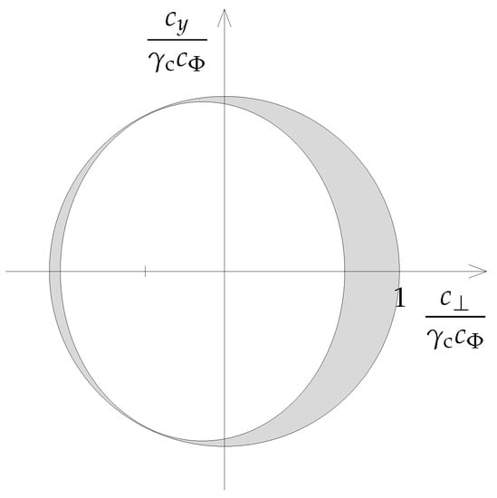 Figure 2. The points of the disk of radius one that yield quantum no-scale regimes (QNSRs) and sit in the left and right shaded crescents, respectively.However, the additional condition arising from the dynamics of and amounts to restricting to the shaded regions: the left and right crescents yield QNSRs and , respectively. - Due to this restriction to the shaded domains, the QNSR turns out to always be perturbative. The one is also perturbative, except in the neighborhood of the tips of the right crescent [].