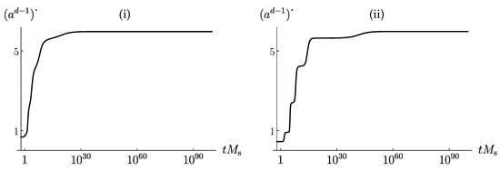 (ii) What are the properties of these flat, expanding universes? In the stringy Scherk–Schwarz mechanism, the supersymmetry breaking scale is a field, for some constant , that parameterizes at the tree level a flat direction of a classical potential . As a result, is referred as the “no-scale modulus”, and the classical model is said to be a “no-scale model” [,,,]. In the cosmological evolutions, we find at the quantum level the classical kinetic energies of of the dilaton and of moduli fields to be characterized to dominate over and the kinetic energies of the remaining moduli. As a result, the expanding solutions approach asymptotically those found classically, when the one-loop potential is not taken into account, or alternatively when vanishes (up to exponentially suppressed terms). In other words, the no-scale structure present at the classical level and broken by quantum effects is restored cosmologically. For this reason, we will say that the universe enters dynamically into the “quantum no-scale regime” (QNSR). Moreover, we will see that no Higgs-like instability occurs in such a regime, whether moduli sit at minima, maxima, saddle points or actually anywhere in moduli space.
