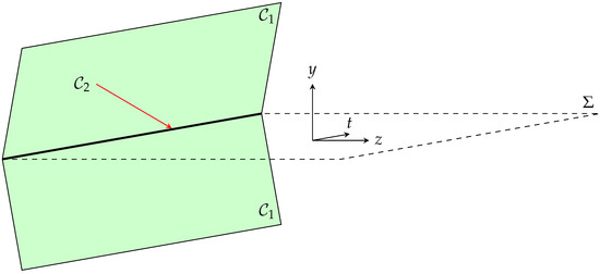 Therefore, naively speaking, y is the coordinate orthogonal both to the codimension-2 brane and to , while z is the coordinate orthogonal to the codimension-2 brane and parallel to . The coordinates t, , and are instead parallel to the codimension-2 brane. A sketch of the configuration and of the coordinate choice is given in Figure 1.